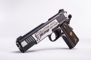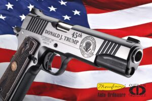 The “Trump 1911” starts as a 5 inch Thompson Custom 1911, chambered in .45 ACP. Its slide and frame are stainless steel, with Thompson medallion inlaid wood grips. The pistol features combat sights, full length guide rod, high sweep beavertail, skeletonized trigger, checkered front strap, and match grade barrel. Engraved on the right side is “Donald J. Trump” with the number 45, and the Seal of the President of the United States. On the left side is a picture of President Trump, the White House, and his slogan “Make America Great Again”. The United States flag is engraved on both sides of the dust cover.